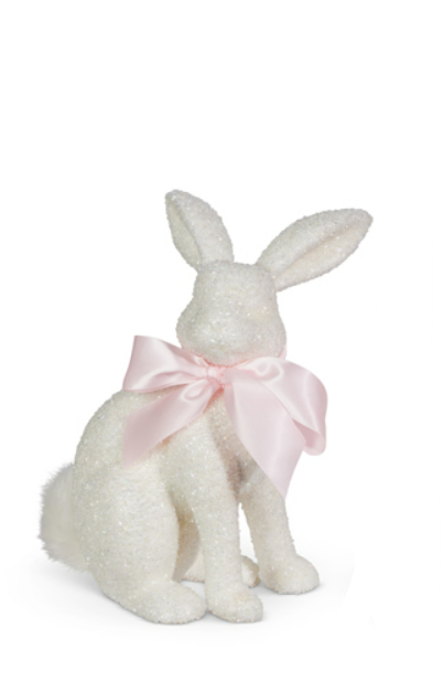 Add some whimsy and sparkle to your home with our RAZ Sitting White Glitter Rabbit! This charming rabbit features a soft white coat adorned with glitter and a playful pink bow. Perfect for any rabbit lover, this little companion will delight and bring joy to any space.