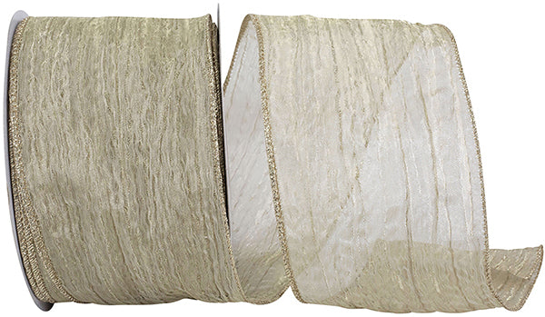 Champagne colored mesh ribbon with gold detailing and wired edge.