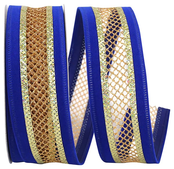 Royal blue and gold velvet mesh middle wired edge ribbon.